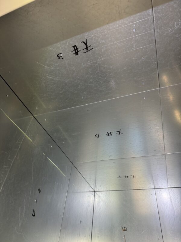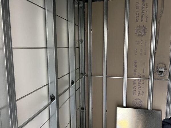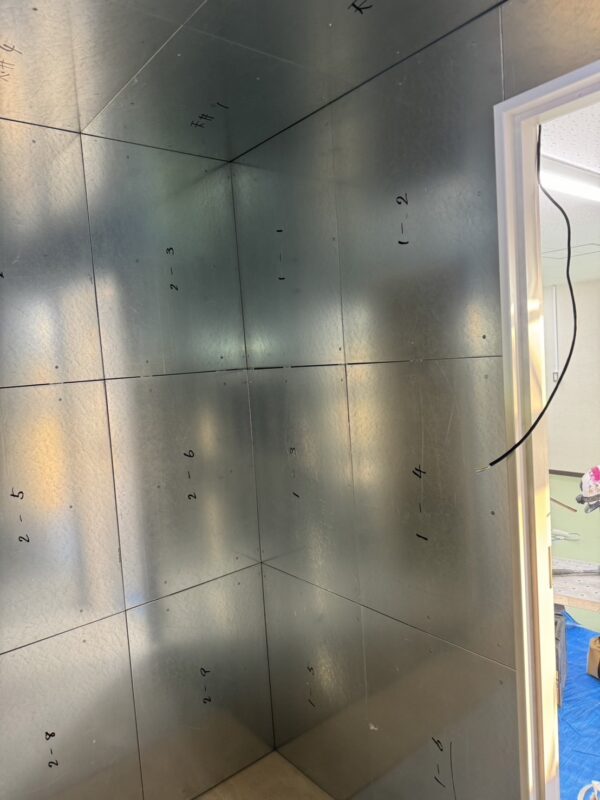 軽量鉄骨の上から、金属の塞ぎ板を張っていきます。